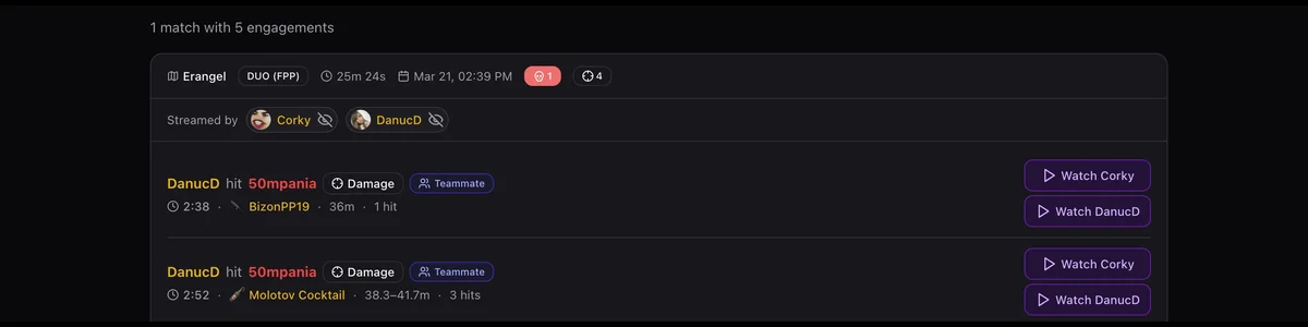 Stream Appearances now shows individual engagements with weapon, distance, and kill context — plus a new Teammate POV feature that surfaces fights you were in even when a broadcaster's squadmate was the one who fought you.