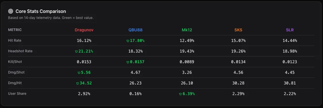 PUBG multi-weapon comparison is live. Stack up to 5 weapons side by side and let 14-day telemetry data settle the debate.